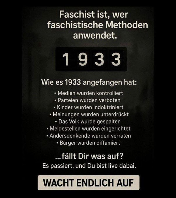 Noch 2019 habe ich eine langjährige Freundschaft, aufgrund eines weitergeleiteten Whatsapp-Posts, der Nähe zur AfD und Reichsbürgern aufzeigte, gekündigt. So kann man sich selbst täuschen, wer die WAHREN Faschisten sind!
